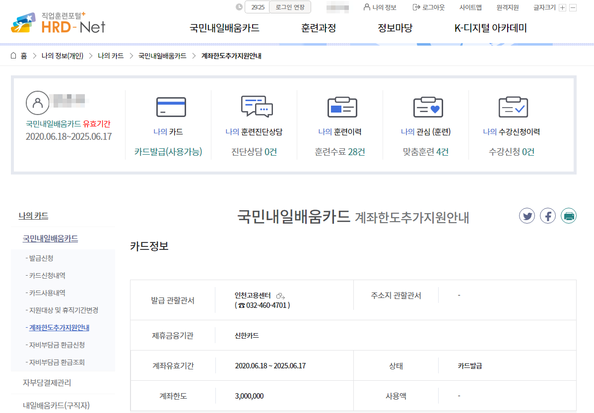 국민내일배움카드 발급 후 카드 HRD-Net 홈페이지 내에서 사용 내역 현황 확인 시 개인별 계좌 한도 확인이 가능한데 기본 300만원을 지원하며, 소진 시 일부 대상자에 한하여 추가로 200만원 범위에서 지원이 가능합니다.